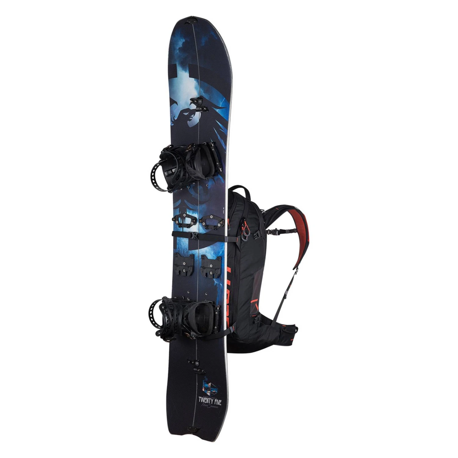 - Seitliche Kompressionsriemen mit A-Frame-Skibefestigungssystem und vorderer Snowboard-Befestigungs-Funktion